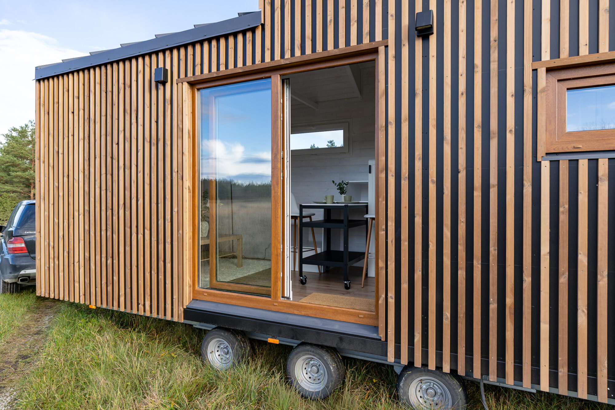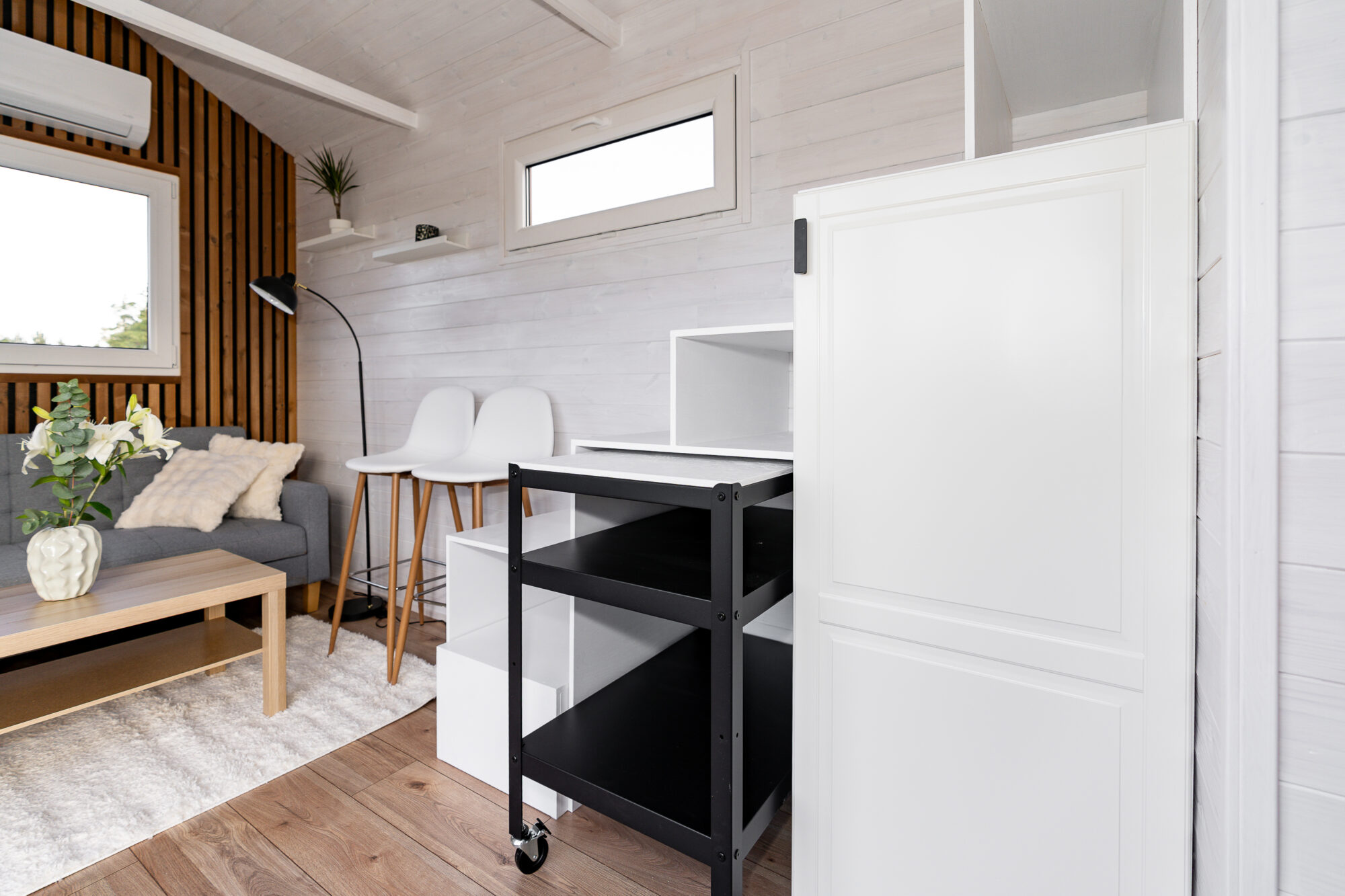 Het huis beschikt over slaapplaatsen voor vier personen (2 plaatsen op de begane grond + 2 plaatsen op de vide). De vide is bereikbaar via een multifunctionele trap die tevens dienstdoet als kast. Deze kast is bovendien voorzien van een uitklapbare werk-/eettafel.